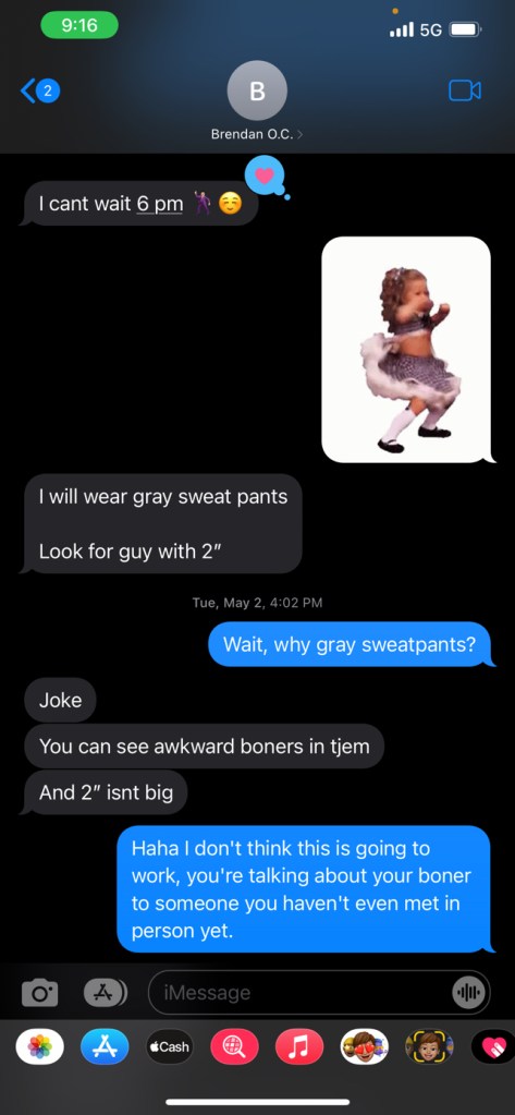 But not to this extent of stupidity. And not two hours–yes, TWO hours, folks–prior to even meeting in person on our first date.