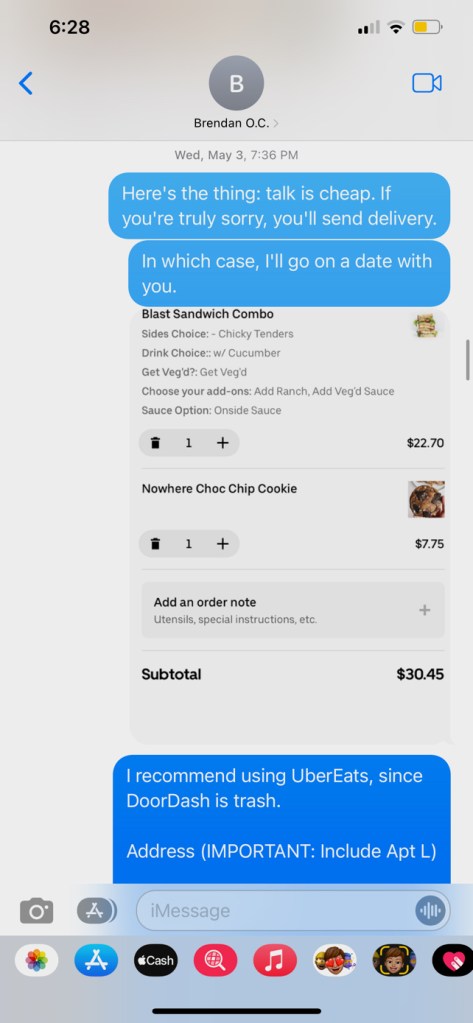 If he’s really sorry, he’ll send delivery food.