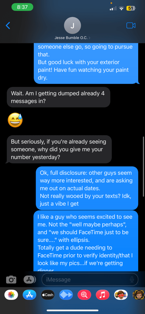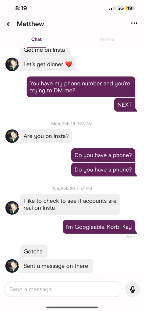 And sure enough, Hinge-cringe Matthew was not trying to confirm my authenticity. Instead, he proceeded to DM me slightly crude (almost kinda flatteringish?) messages in response to specific photos….
