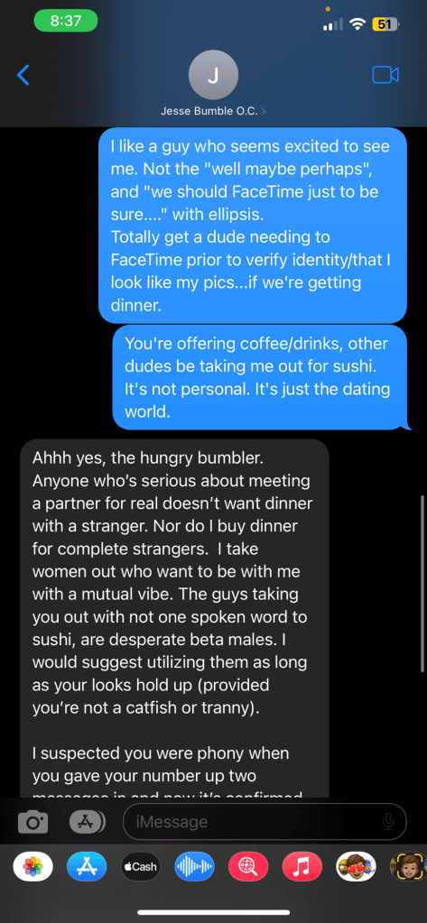 We didn’t make it beyond one date. I was actively appalled by him complaining about “being the smartest person” in his engineering program at Cal State Long Beach. The fact that he resembled a toaster, unbeknownst to me through his Bumble pictures, didn’t help.