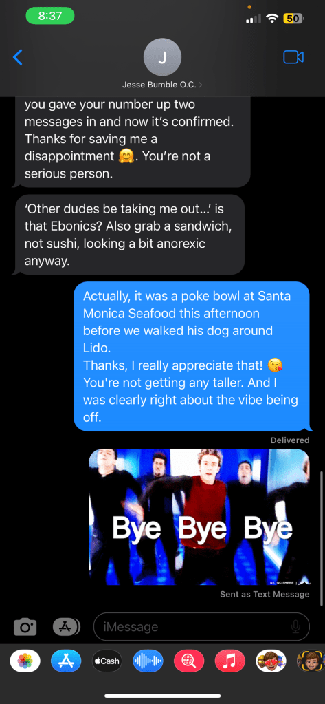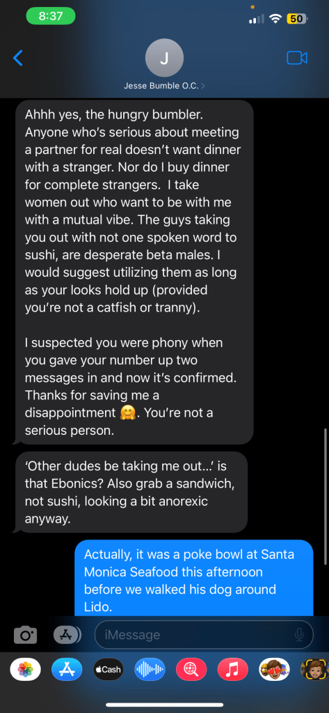 I’m still struggling to understand why, when given my phone number, an alarmingly high percentage of matches prefer to slide into my DMs via Instagram rather than text or call me. Although more LA men would rather attempt to jerk off to my online photos than actually enjoy my presence in real life, a significant amount of Orange County app users seem just as addicted to the ‘gram.